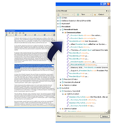Jump! is powered by a unique text analysis engine which extracts sentences and their subjects, verbs and objects from unstructured text. Jump! resolves pronouns (he/she/it) and acronyms (CEO/AGM) and indexes them under the terms they refer to. Jump! creates an index of all the contents of a document – to help you find the information you need more quickly.